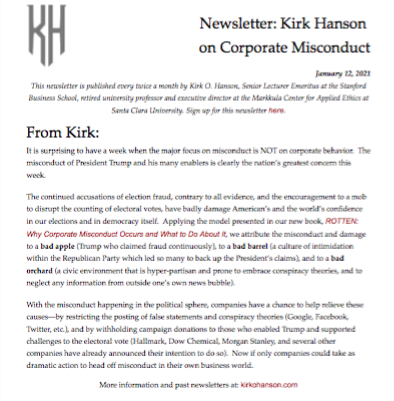 Features a statement from Kirk on events at the Capitol on January 6, a featured video from 10 years ago, recent blogposts entitled “What Responsibility Does a Company Have for the Rogue Employee - The Bad Apple” and “Ethics Risks Companies Face in 2021” and a link to Kirk’s new book that was officially released in January.