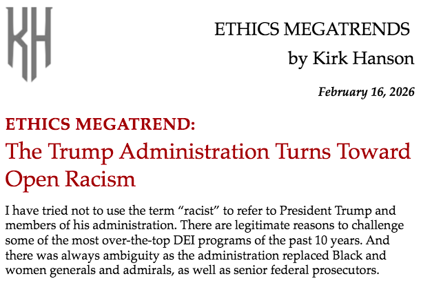 Kirk documents the shift to open racism from the Trump administration in this ETHICS MEGATRENDS newsletter.