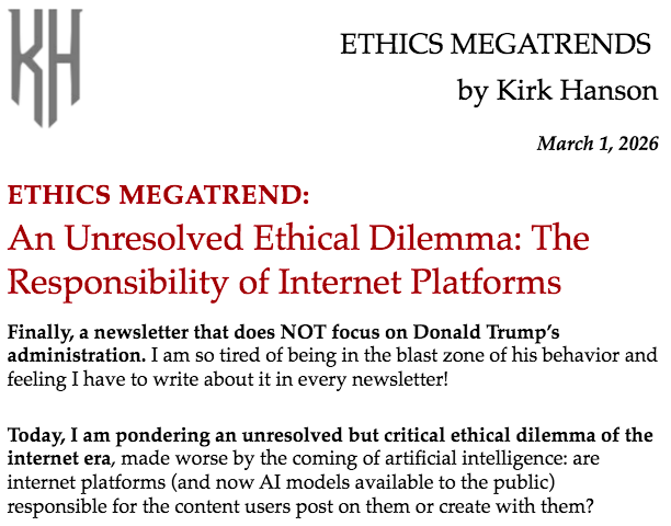 This ETHICS MEGATRENDS newsletter starts a series in which Kirk details a dozen ethical areas that will be focused on in his upcoming book.